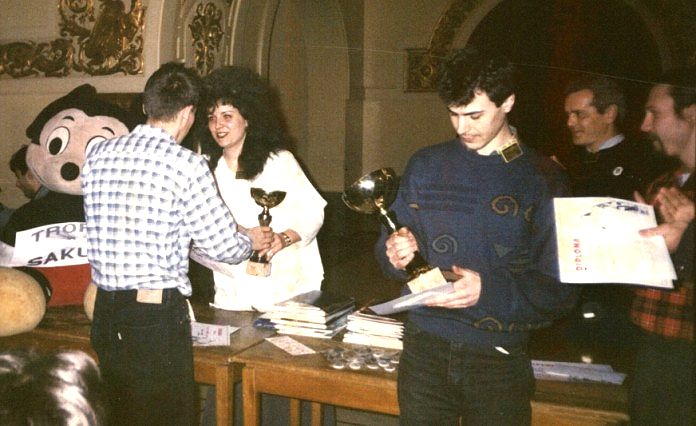 (Carmen Mateescu ii inmineaza cupa lui Dragos Bajenaru; alaturi Dan Cioata iar in spate Luchi Calota si cu mine)