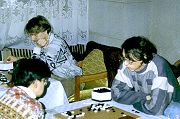 Statusem mai toata ziua facind invitatia pe calculator si mai apoi copiind-o in mai multe exemplare. Bineinteles ca ne mai pierdusem vremea si cu ceva Go ... Codin tocmai trecuse pe la el si-si xeroxase niste partide vechi, chinezesti. Ne-am uitat si noi peste ele. Erau dintr-acelea care incepeau cu cite patru pietre asezate in colturile tablei ...