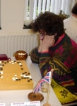 Partida mea cu MacFadyen a fost un test de vointa, am avut de infruntat complicatii dupa complicatii. Prima lui mutare a fost 5x5, apoi am jucat o varianta complicata de o-nadare joseki in coltul opus care a degenerat intr-un ko. Am castigat ko-ul dar lupta s-a intins spre mijlocul tablei pana ne-am lovit de piatra aceea inalta de la 5x5. Am reusit sa ma strecor pe sub ea facand destule puncte, ceea ce mi-a adus un avantaj, dar a trebuit sa supravietuiesc apoi cu un grup in centru. Am reusit sa traiesc fara sa-mi stric prea mult ultimul colt si in final am iesit in fata. Tin minte ca la sfarsitul partidei MacFadyen avea ochii umezi. Probabil nu-si inchipuise ca poate pierde, insa eu m-am tinut tare si am facut fata unui stil care era si este exact pe gustul meu. Niciodata n-am dat inapoi de la un caft pe tabla de go.